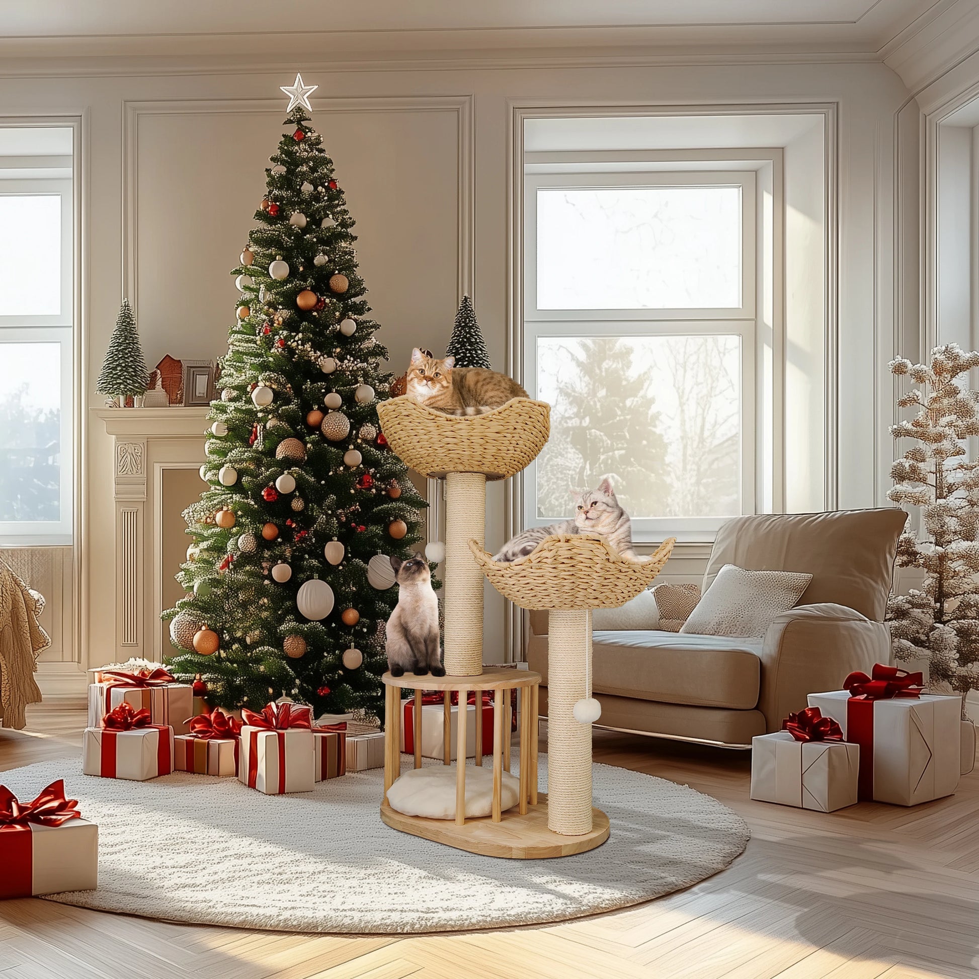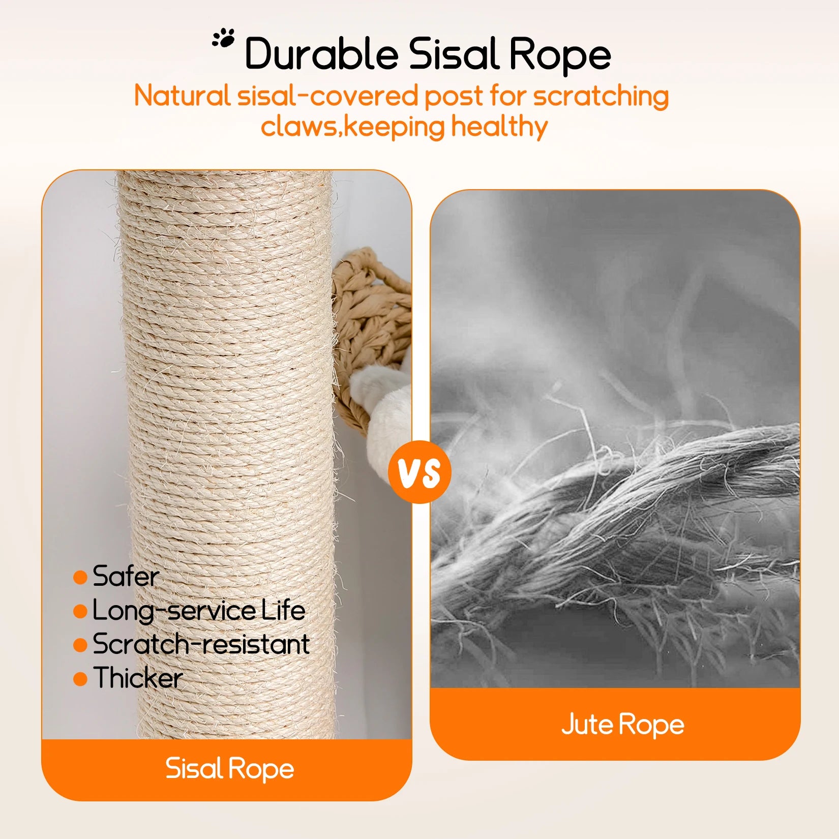 Well-designed Cat Tree : 38.98 inches tall cat activity centre, it features two baskets and one condo, both are with plush cushion pads inside, easy to remove for cleaning, creating cozy spots for cats to lounge, curl up and rest, the sisal-covered post satisfies cats' instinctive need to scratch, saving your furniture from their paws, incorporating dangling balls attached on the baskets for more entertainment and prevent boredom