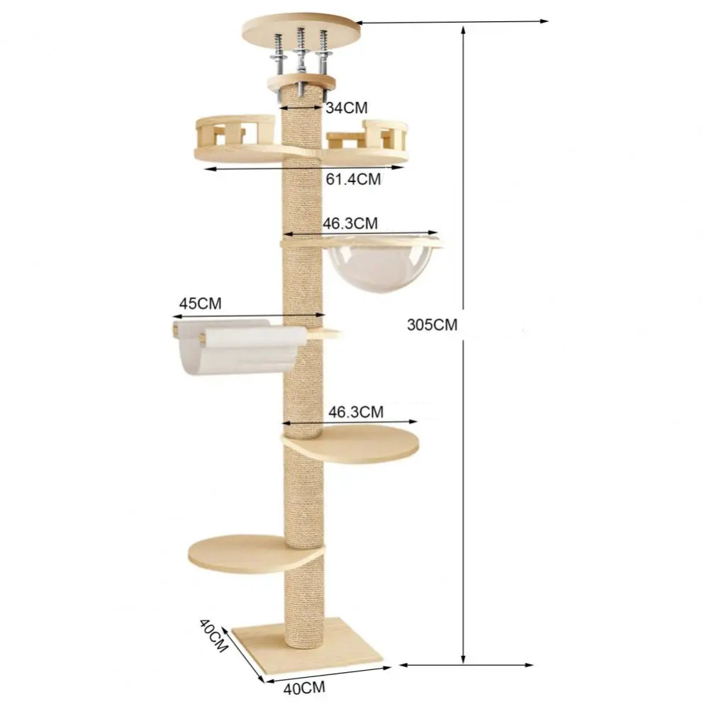Chaque détail a été pensé pour le confort et la sécurité : une base solide, des poteaux en chanvre naturel pour les griffades, un nid douillet, une capsule d’observation futuriste, et plusieurs plateformes d’escalade pour un divertissement sans fin.
