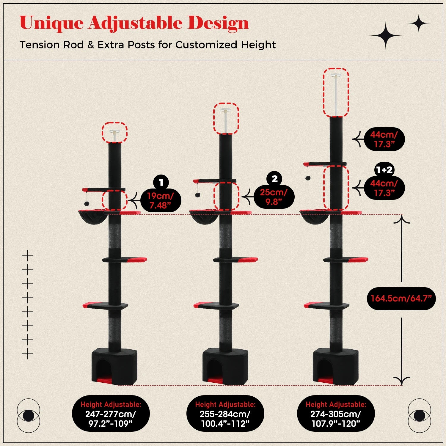 Adjustable Height Cat Tree for Indoor, Floor to Ceiling Cat Tower with Scratching Posts, Cat Condo, Hammock and Dangling Balls