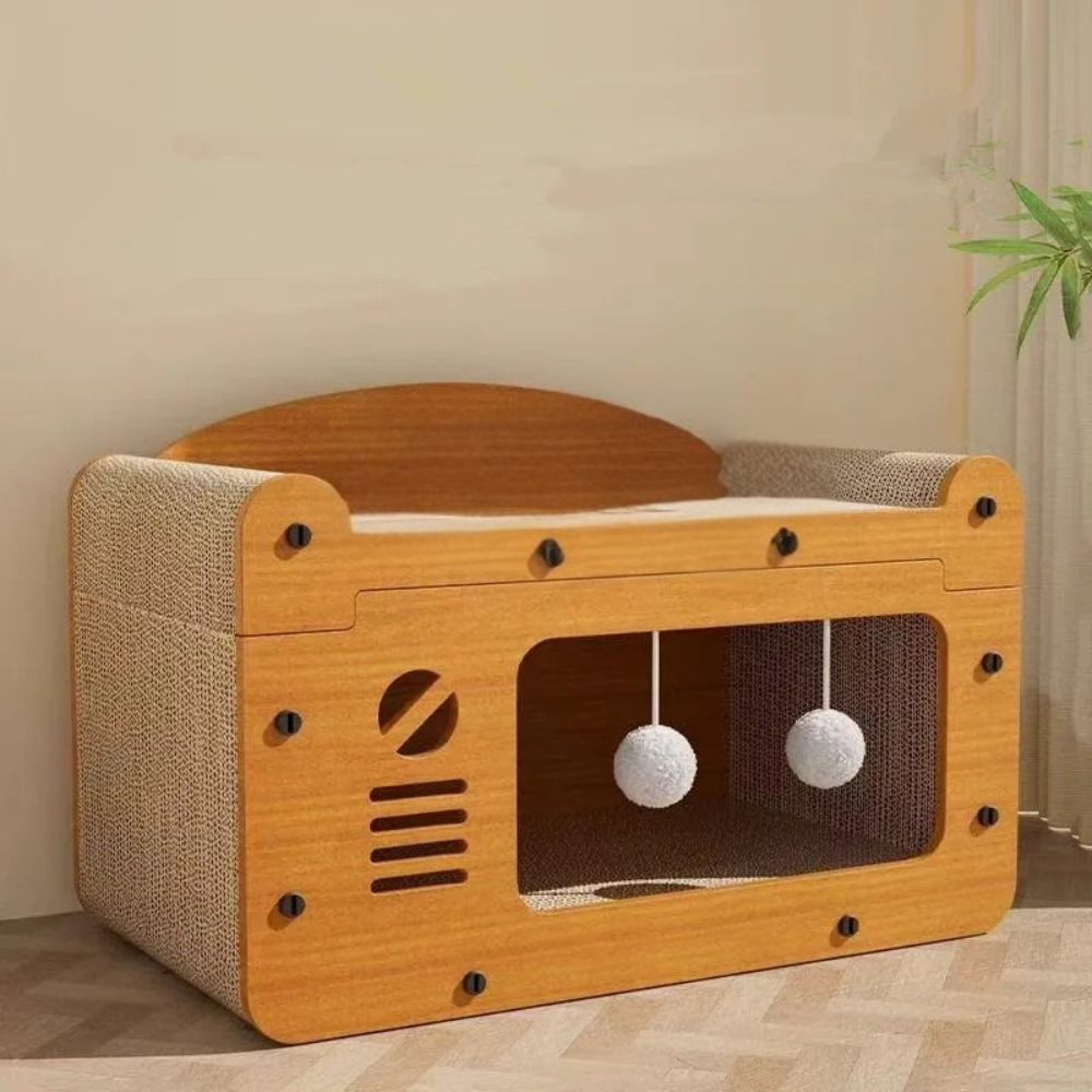 Ce modèle en bois combine esthétique et praticité, avec une large surface en carton ondulé pour griffer, un trou de jeu pour se cacher, et une balle suspendue qui éveille son instinct de chasseur.
