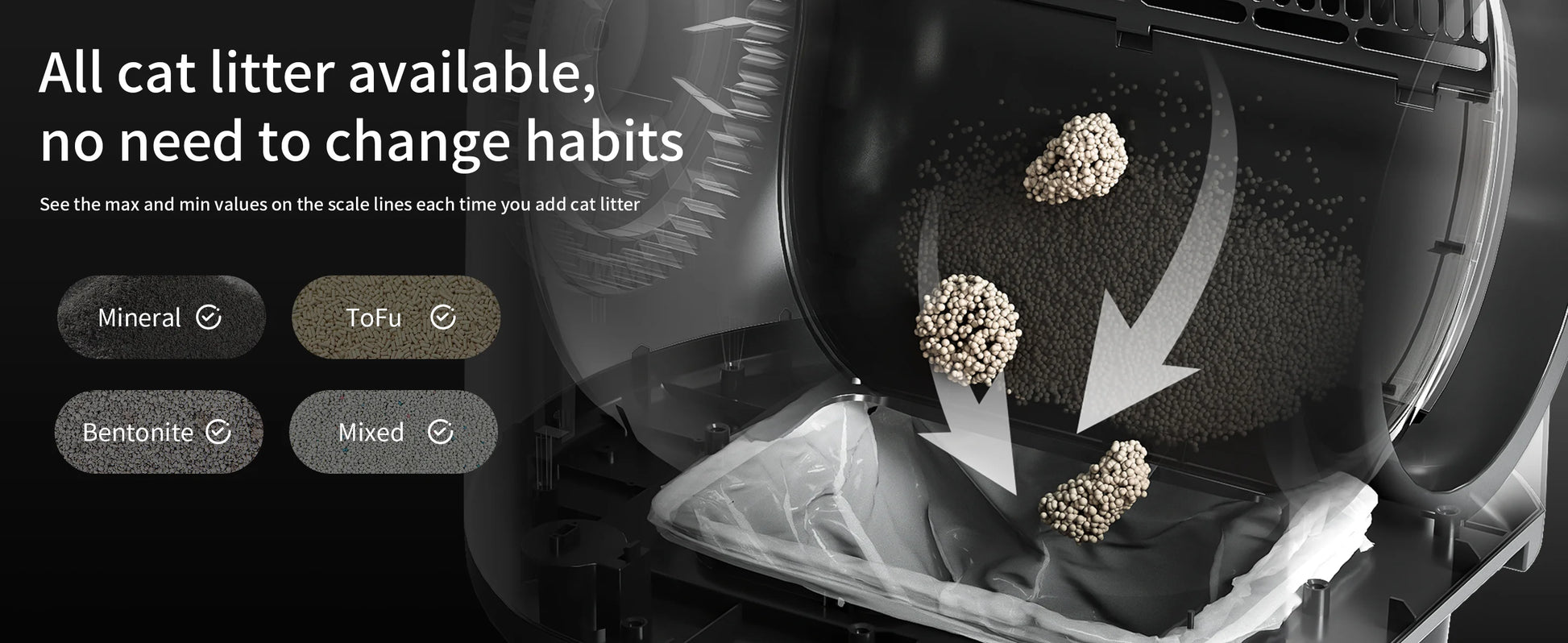 [True odor control] : REDSASAelectric litter box features a semi-enclosed design that offers odor control 5 times better than traditional litter boxes. This design effectively isolates the litter to reduce odor spread while maintaining an open feel. The electric cat litter box self cleaning drum interior is equipped with an advanced odor elimination and fragrance system that breaks down odor molecules inside the electric cat litter box, keeping the air fresh. Additionally, our ventilation system actively expels odor molecules with a built-in fan.This innovative design not only enhances odor control but also provides a more comfortable and fresh environment for your home.