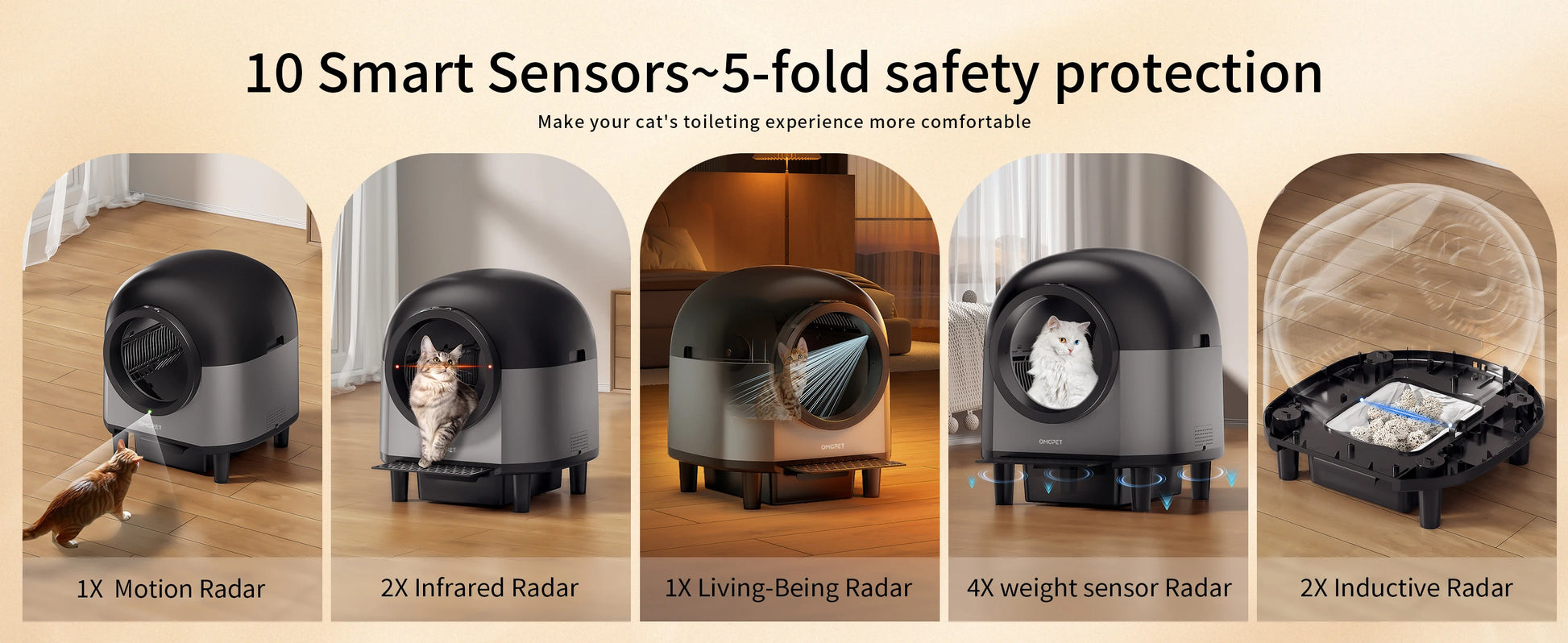 [10 Safety Sensing Radars] : REDSASAcat litter box automatic cleaning is equipped with 10 safety sensing radars that intelligently detect the presence of your cat. Once the radar detects a cat is approaching the automatic litter box self cleaning, the auto litter box system immediately stops the rotation of the drum to ensure the cat's absolute safety. This advanced technology effectively prevents any harm to your cat during use, giving pet owners peace of mind.