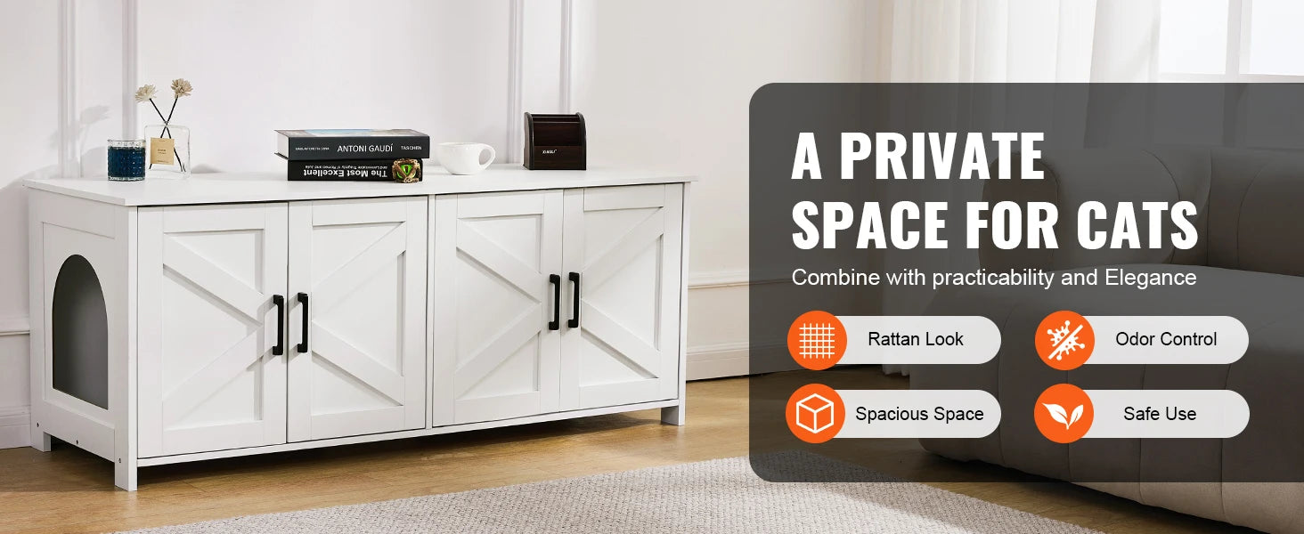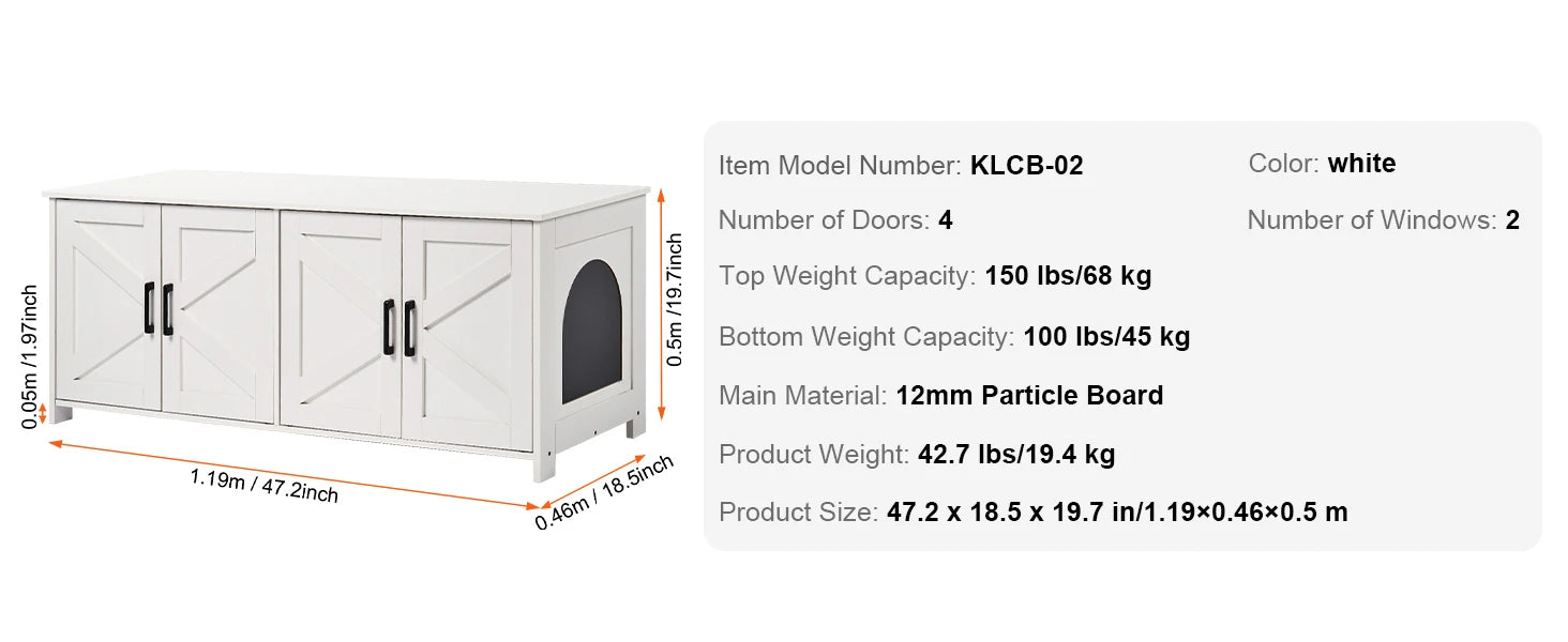 Spacious Space: Measuring 47.2x18.5x19.7in, this cat litter box furniture provides a comfortable and free resting space for pets. It can accommodate cat litter boxes with a length of less than 21" and a width of less than 17.7". It is equipped with 4 doors and 2 windows for cats' easy access freely.